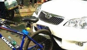 海口街头丰田轿车追尾自行车 轿车受损自行车完好