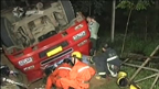 运输燃气车翻车 两人被困消防营救