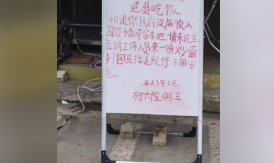 疫情之下,万宁一家餐厅贴出暖心告示,提供免费餐食