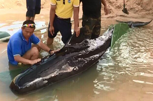 领航鲸搁浅陵水海湾 全力救治20多小时后死亡