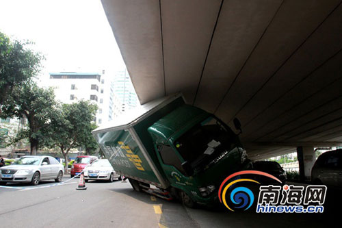 实拍:海口邮政车为躲电动车“钻”南大桥下 吊车帮“解困”