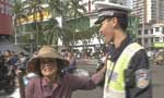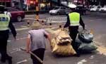 海口最暖心照片:协警手提废品护送拾荒老人过马路