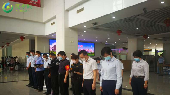 椰视频|海口汽车客运总站候车大厅内 工作人员和乘客低头默哀