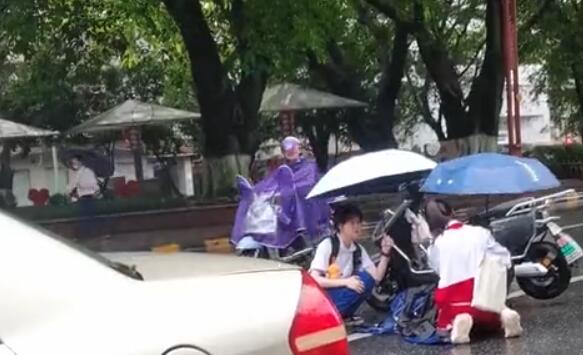 老人雨天骑车不慎滑倒 两名女生上前为其撑伞