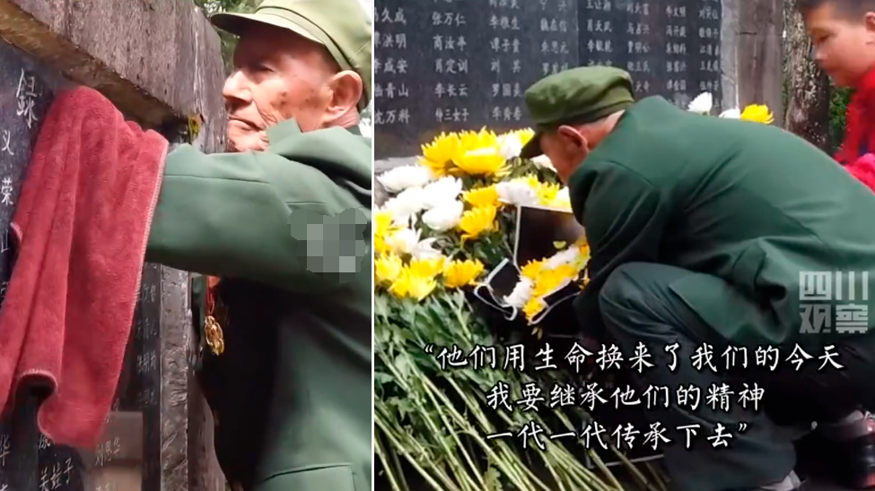 视频 | 致敬英雄!志愿军老战士用残臂擦拭烈士墓碑