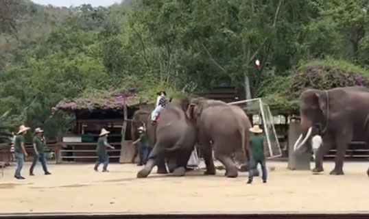 视频 | 云南一景区大象表演时突然打起架来 数名工作人员现场劝架