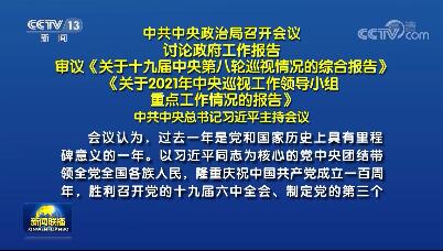 中共中央政治局召开会议 讨论政府工作报告 审议《关于十九届中央第八轮巡视情况的综合报告》《关于2021年中央巡视工作领导小组重点工作情况的报告》 中共中央总书记习近平主持会议