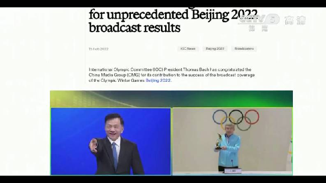 巴赫祝贺中央广播电视总台冬奥会业绩斐然 并向总台台长颁发国际奥委会主席奖