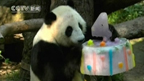 美国熊猫姐妹过生日 享用超大蛋糕