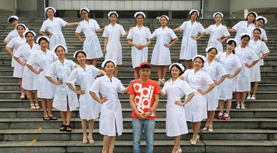 湖南高校护理学院拍毕业照 众女衬托唯一男生