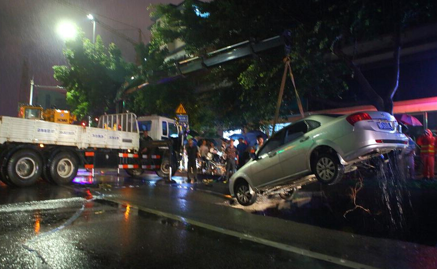 深圳遭暴雨突袭路面塌方 车辆掉入大坑