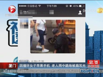 撞坏女子苹果手机老人被逼雨中跪地扇耳光
