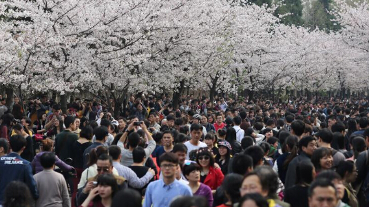南京古刹鸡鸣寺“赏樱大军” 挤爆整条街道