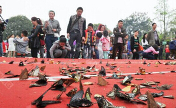成都商家放飞蝴蝶遭哄抢 还未起飞即被踩死一地