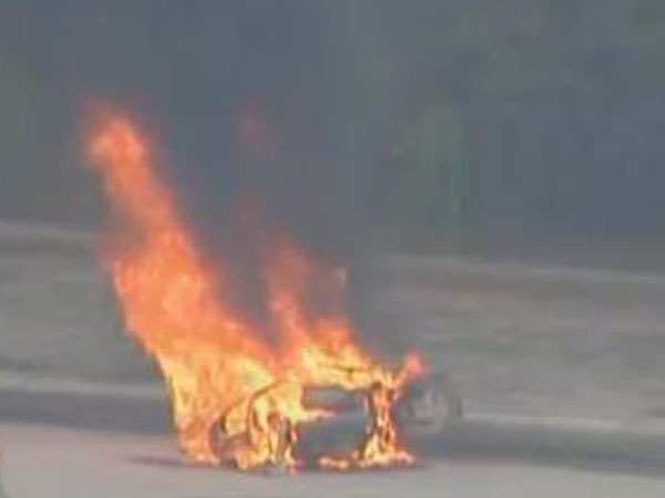 实拍两男子不服交警处罚当街烧车