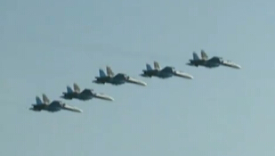 实拍俄罗斯勇士队表演5机横队向观众致意