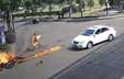 浙江:摩托车与汽车碰刮后漏油 驾驶员瞬间变火人