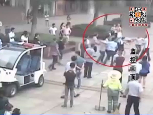夫妻当街追打城管 躺地大喊“城管打人了”