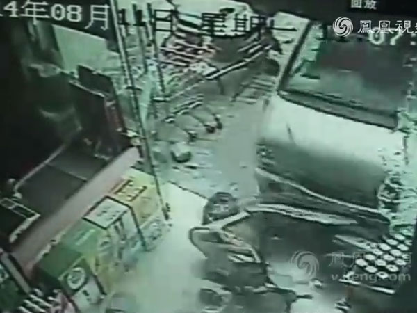 实拍面包车蹿上人行道冲进超市碾压顾客