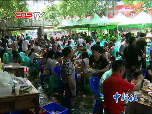 重庆市民避暑奇招 水中享用美食