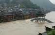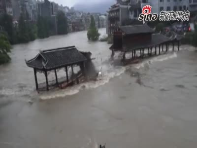 实拍凤凰古城巨大洪流冲垮小桥瞬间