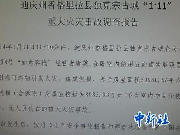 云南公布独克宗古城火灾通报 建议处分县长等10人
