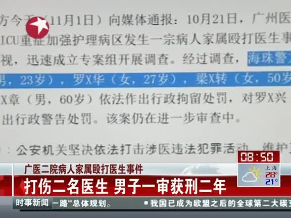 广医二院病人家属殴打医生:打人者获刑2年